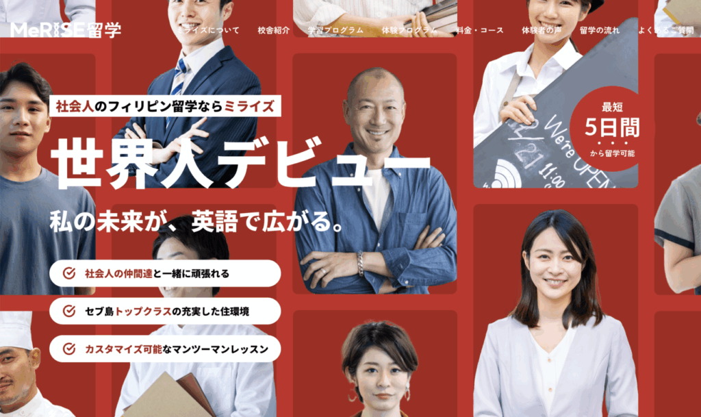 MeRIZE留学は、「フィリピン留学=学生向け」「仕事を辞めないと行けない」といった従来のイメージを覆し、社会人が働きながら英語を学べるという新しいスタイルの留学を実現しています。